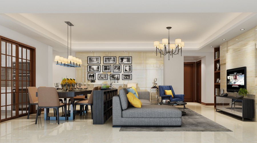 ① 我們用了一個(gè)與沙發(fā)等高的書柜作為客餐廳的隔斷,區(qū)劃功能區(qū)的同時(shí),視覺上空間格局依舊開闊;