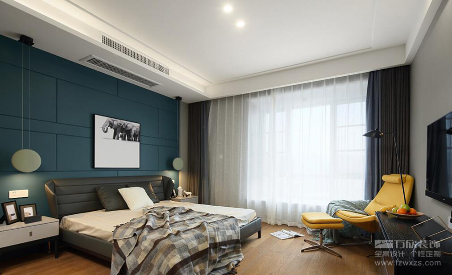 深藍(lán)色的床頭背景似一面靜謐深邃的海,直把人拉向睡眠最深處。大面積的落地玻璃窗讓陽光很好的滲入室內(nèi),整個(gè)空間明亮通透,陽光正好的午后,可以倚在黃色的躺椅上,翻翻雜志,發(fā)發(fā)呆,任時(shí)間流淌~