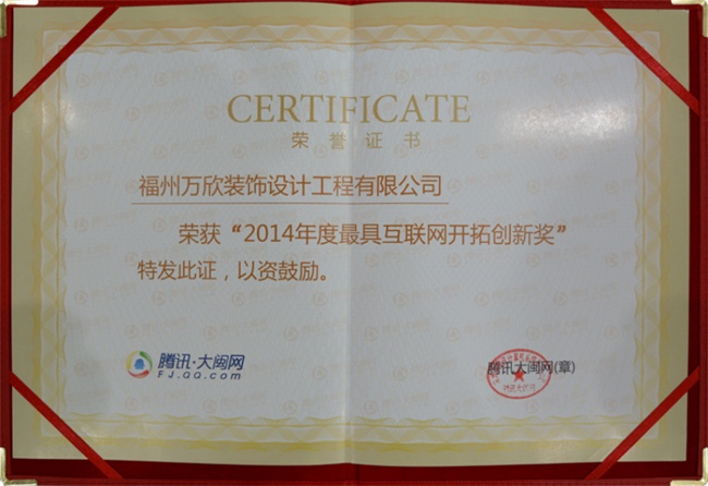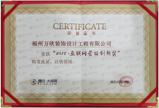 - >騰訊大閩網授予萬欣裝飾"2015·互聯(lián)網營銷創(chuàng)新獎"