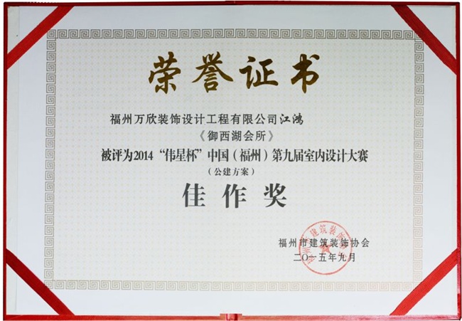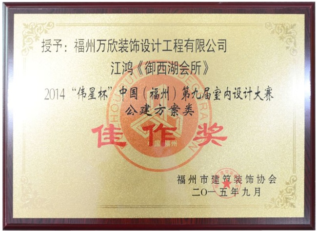 - >萬欣裝飾作品《御西湖會所》被評為中國(福州)第九屆室內設計大賽(公建方案)佳作獎