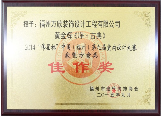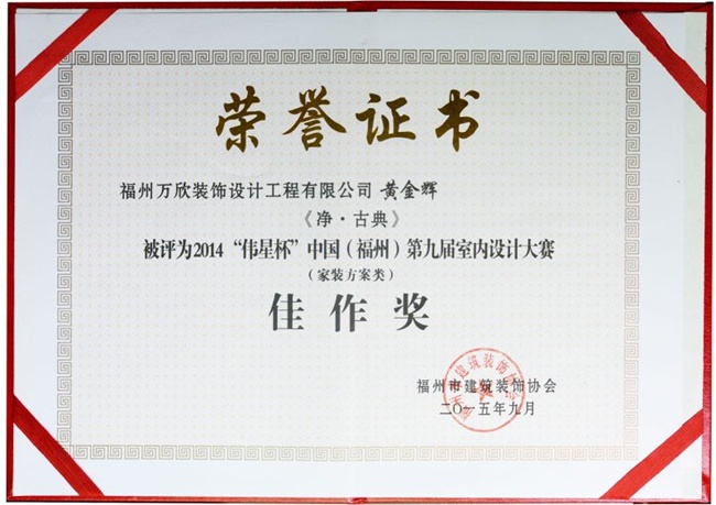 - >萬欣裝飾作品《靜·古典》被評為中國(福州)第九屆室內設計大賽(家裝方案類)佳作獎