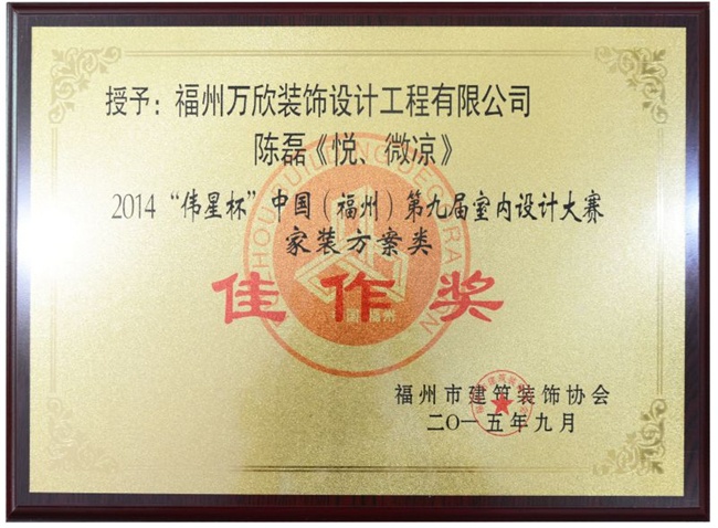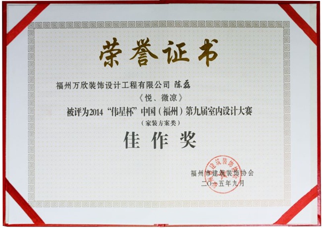 - >萬欣裝飾作品《悅、微涼》被評為中國(福州)第九屆室內設計大賽(家裝方案類)佳作獎