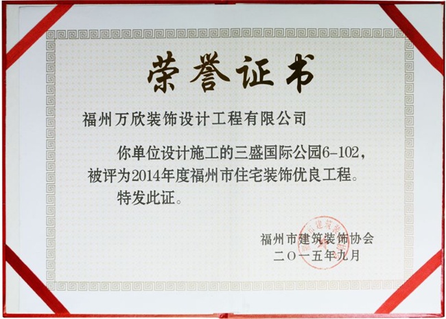 - >萬欣裝飾作品《三盛國際公園9#02》被評為中國(福州)第十二屆室內設計大賽(工程類)三等獎
