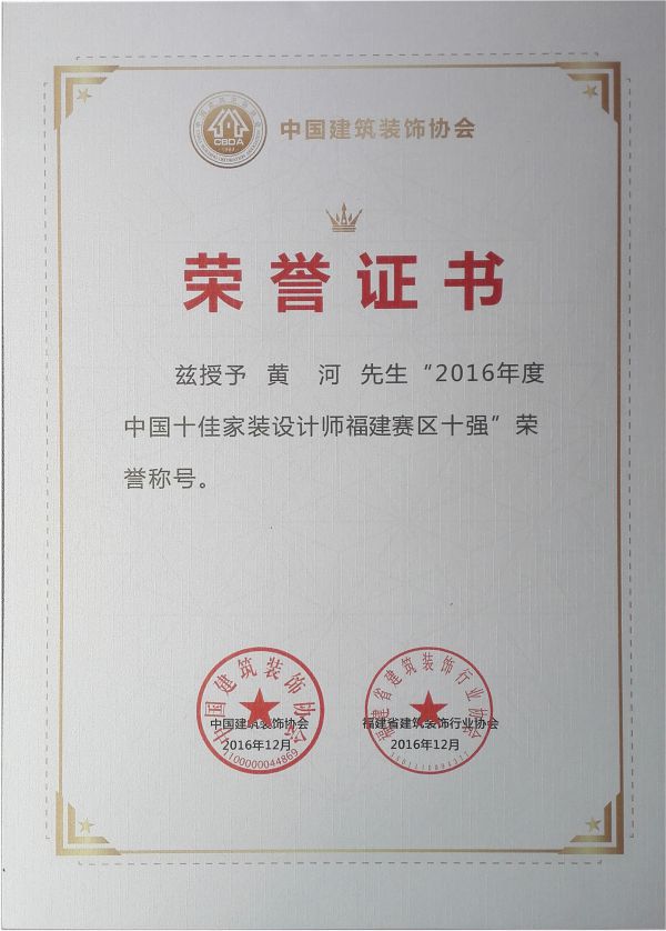 - >黃河榮獲“2016年度中國十佳家裝設計師福建賽區(qū)十強”稱號