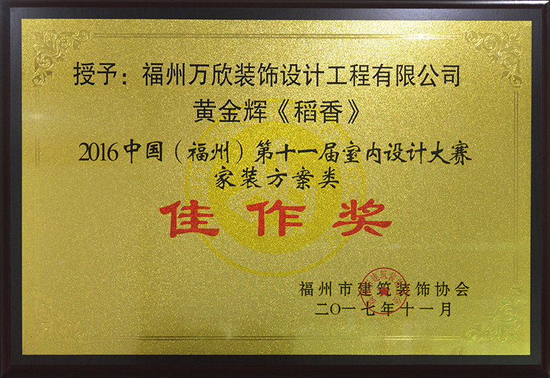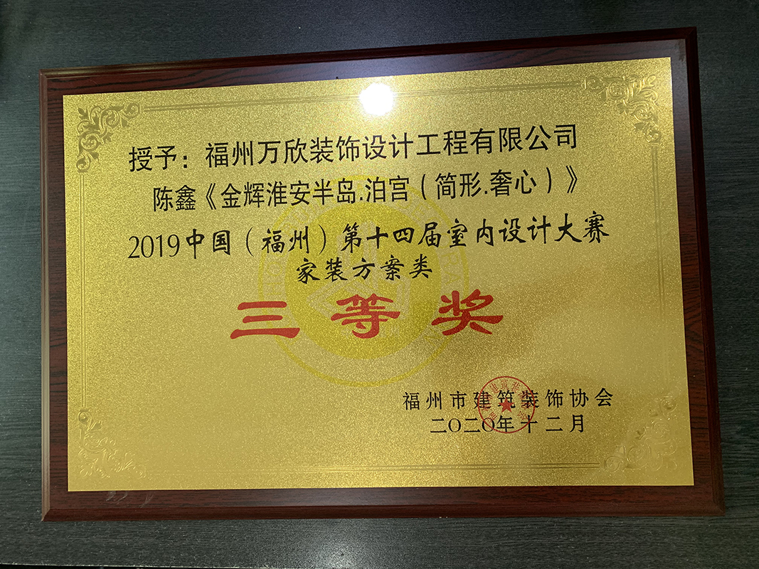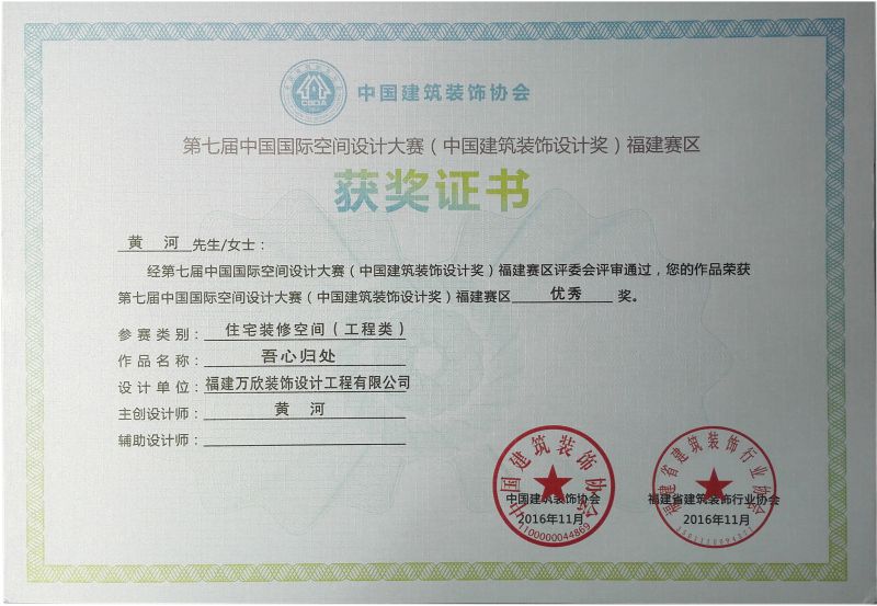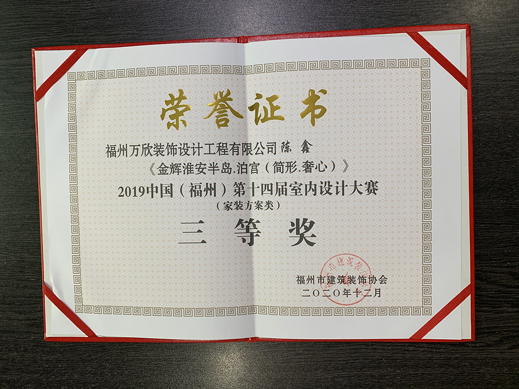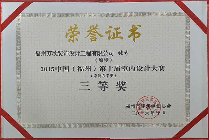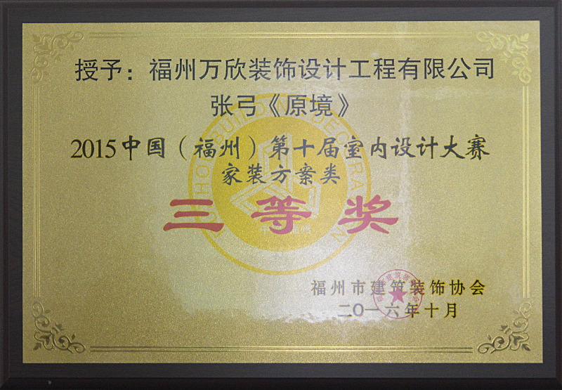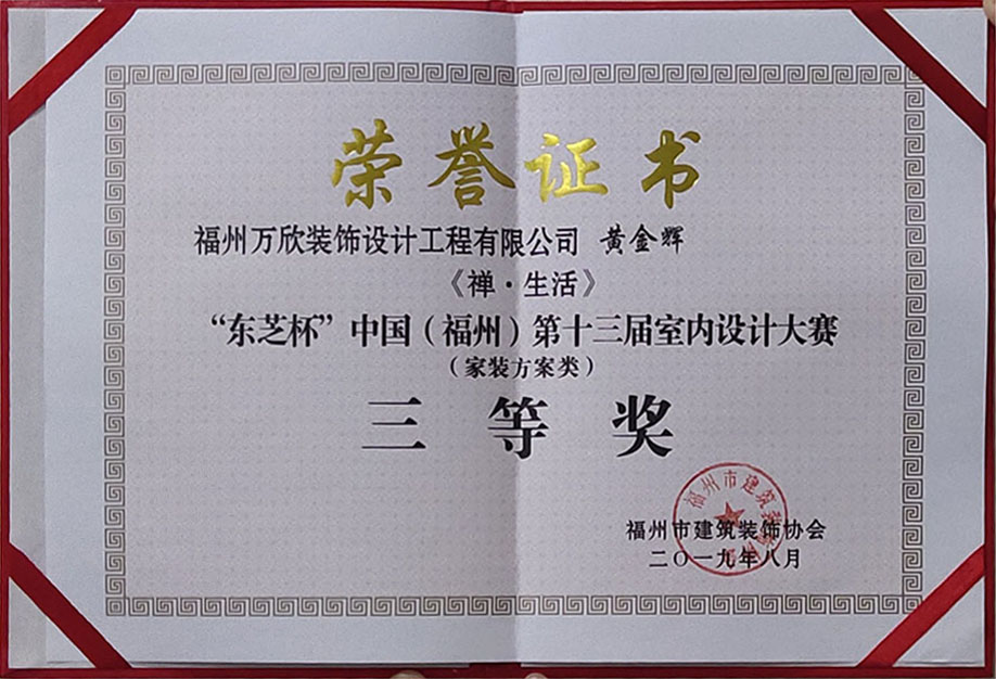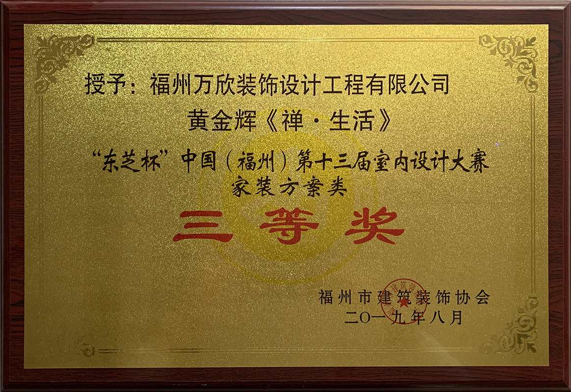 - >萬欣裝飾作品《禪 · 生活》被評為中國(福州)第十三屆室內設計大賽(家裝方案類)三等獎