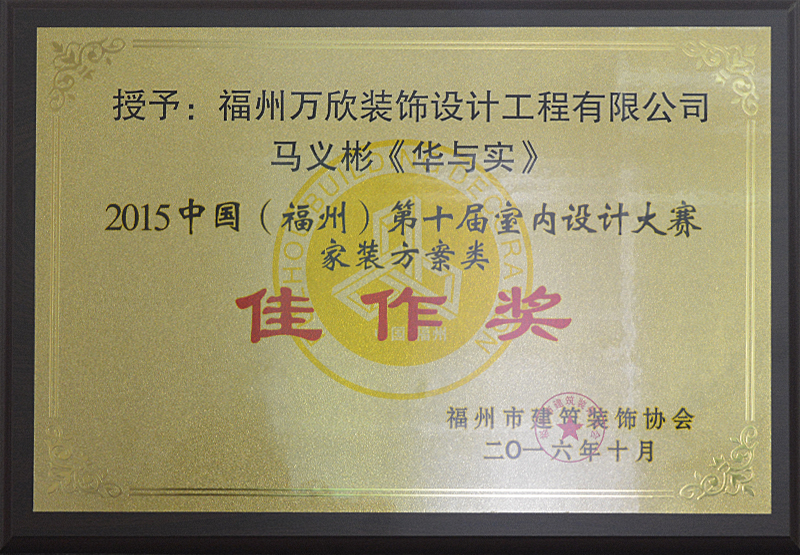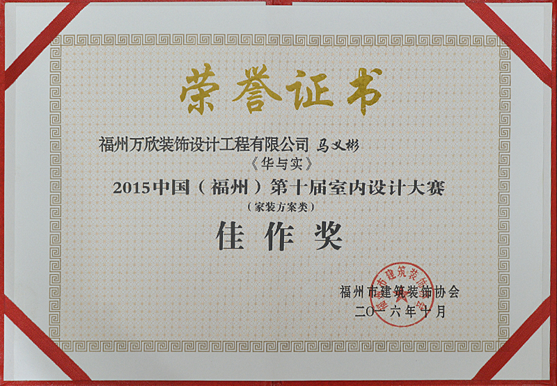 - >萬欣裝飾作品《華與實》被評為中國(福州)第十屆室內設計大賽(家裝方案類)佳作獎