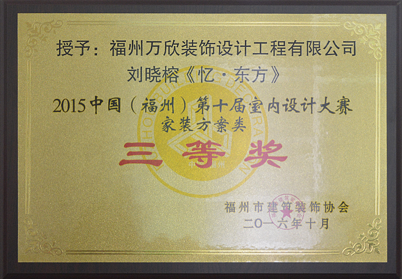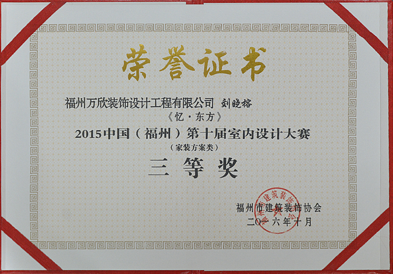 - >萬欣裝飾作品《憶·東方》被評為中國(福州)第十屆室內設計大賽(家裝方案類)三等獎