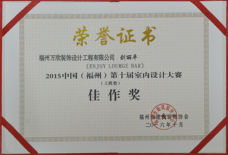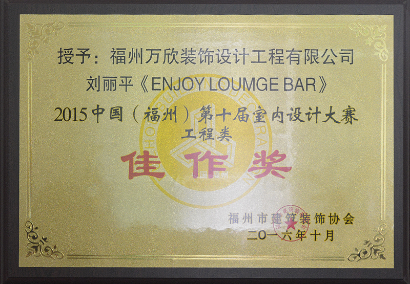 - >萬欣裝飾作品《ENJOY LOUMGE BAR》被評為中國(福州)第十屆室內設計大賽(工程類)佳作獎