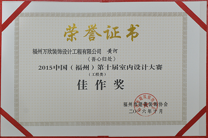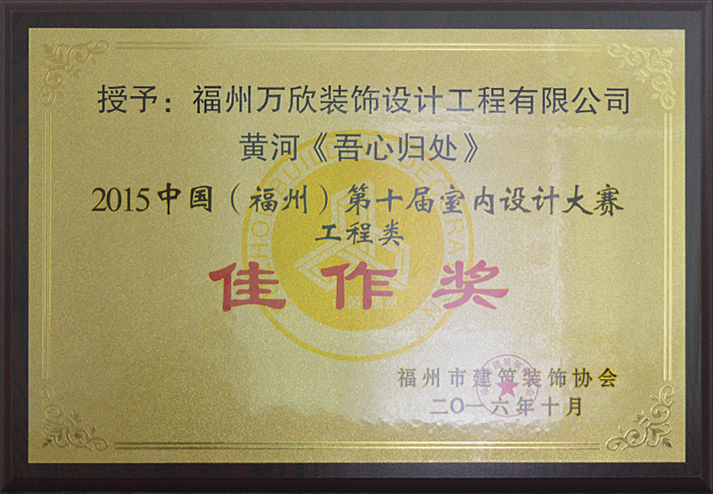 - >萬欣裝飾作品《吾心歸處》被評為中國(福州)第十屆室內設計大賽(工程類)佳作獎