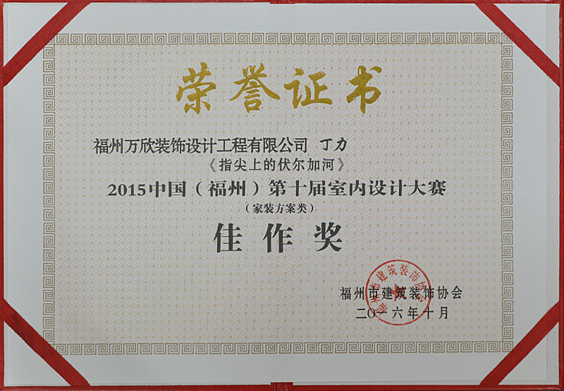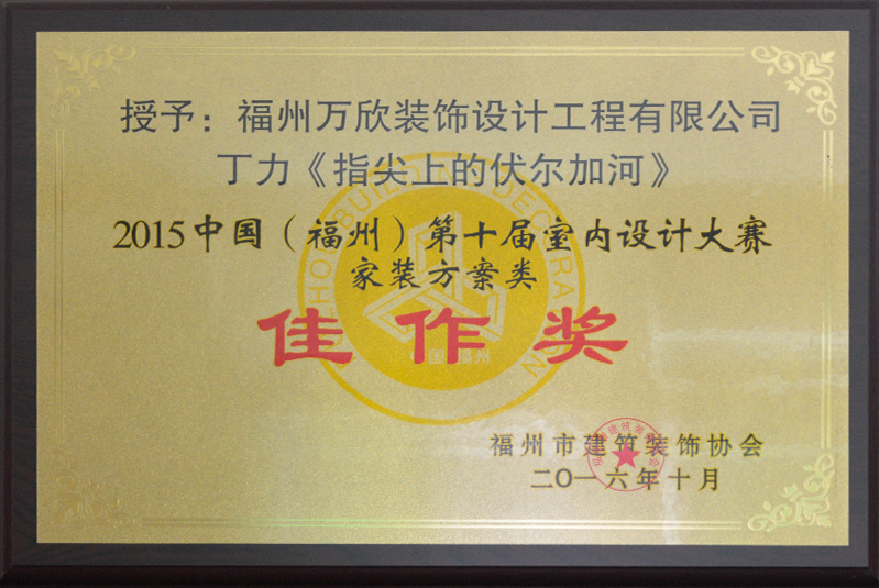 - >萬欣裝飾作品《指尖上的伏爾加河》被評為中國(福州)第十屆室內設計大賽(家裝方案類)佳作獎