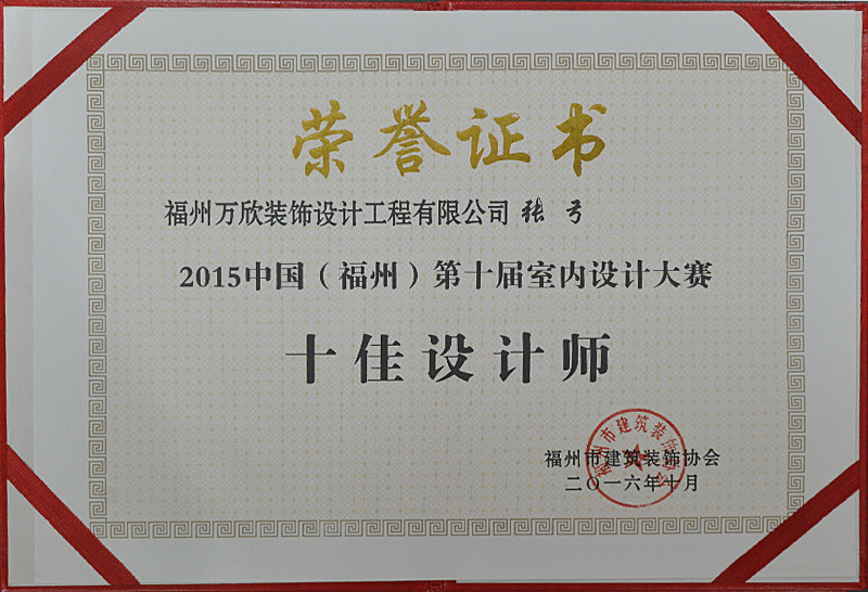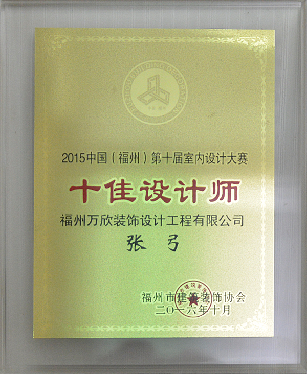 - >萬欣裝飾設計師張弓被評為中國(福州)第十屆室內設計大賽十佳設計師