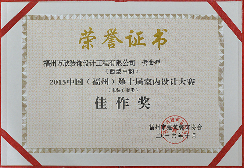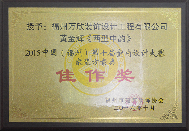 - >萬欣裝飾作品《西型中韻》被評為中國(福州)第十屆室內設計大賽(家裝方案類)佳作獎