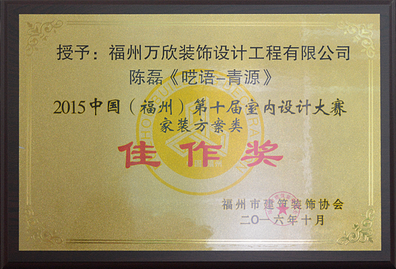 - >萬欣裝飾作品《囈語·青源》被評為中國(福州)第十屆室內設計大賽(家裝方案類)佳作獎