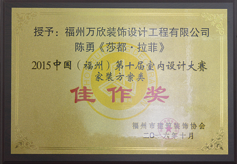 - >萬欣裝飾作品《莎都·拉菲》被評為中國(福州)第十屆室內設計大賽(家裝方案類)佳作獎