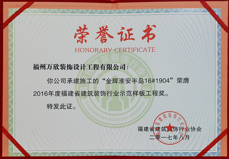 - >萬欣裝飾“金輝淮安半島16#1904”被福建省裝協(xié)評為示范樣板工程獎