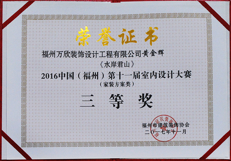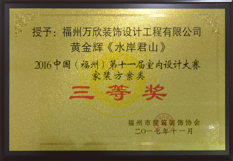 - >萬欣裝飾作品《水岸君山》榮獲中國(福州)第十一屆室內設計大賽家裝方案類三等獎