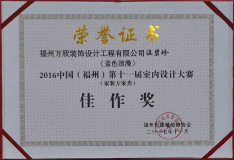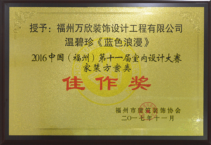 - >萬欣裝飾作品《藍色浪漫》榮獲中國(福州)第十一屆室內設計大賽家裝方案類佳作獎