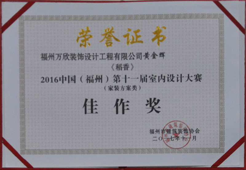 - >萬欣裝飾作品《金輝尊域2#1402》被評為中國(福州)第十屆室內設計大賽(家裝方案類)佳作獎