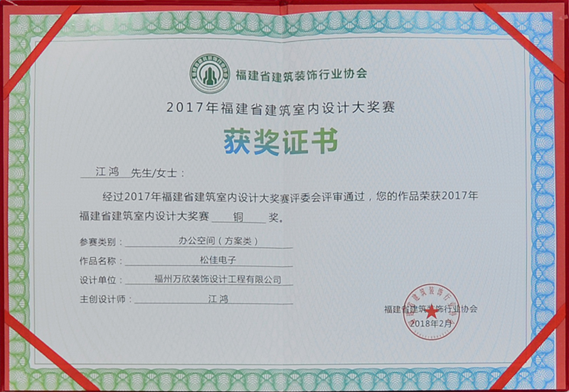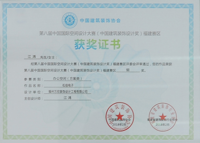 - >中國(福州)第四屆室內設計大賽萬欣裝飾四名設計師的作品獲 二等獎等多個設計獎項