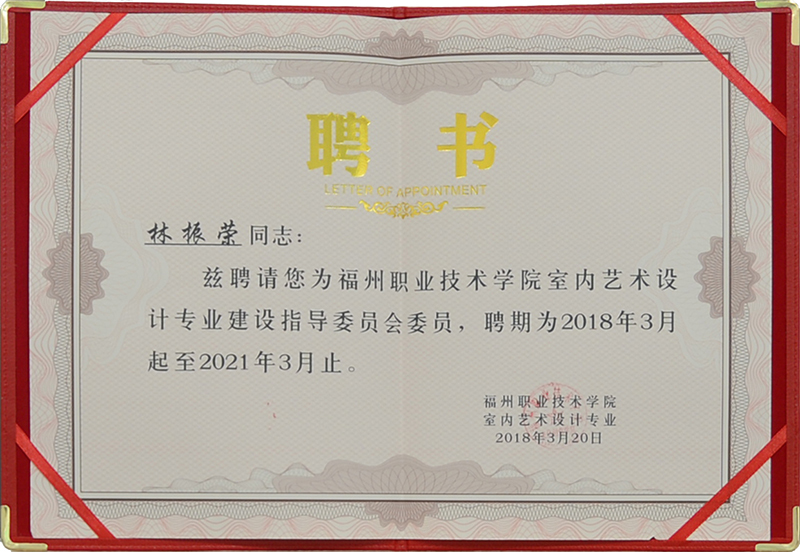 - >聘請林振榮為福州職業(yè)技術學院室內藝術設計專業(yè)委員會委員