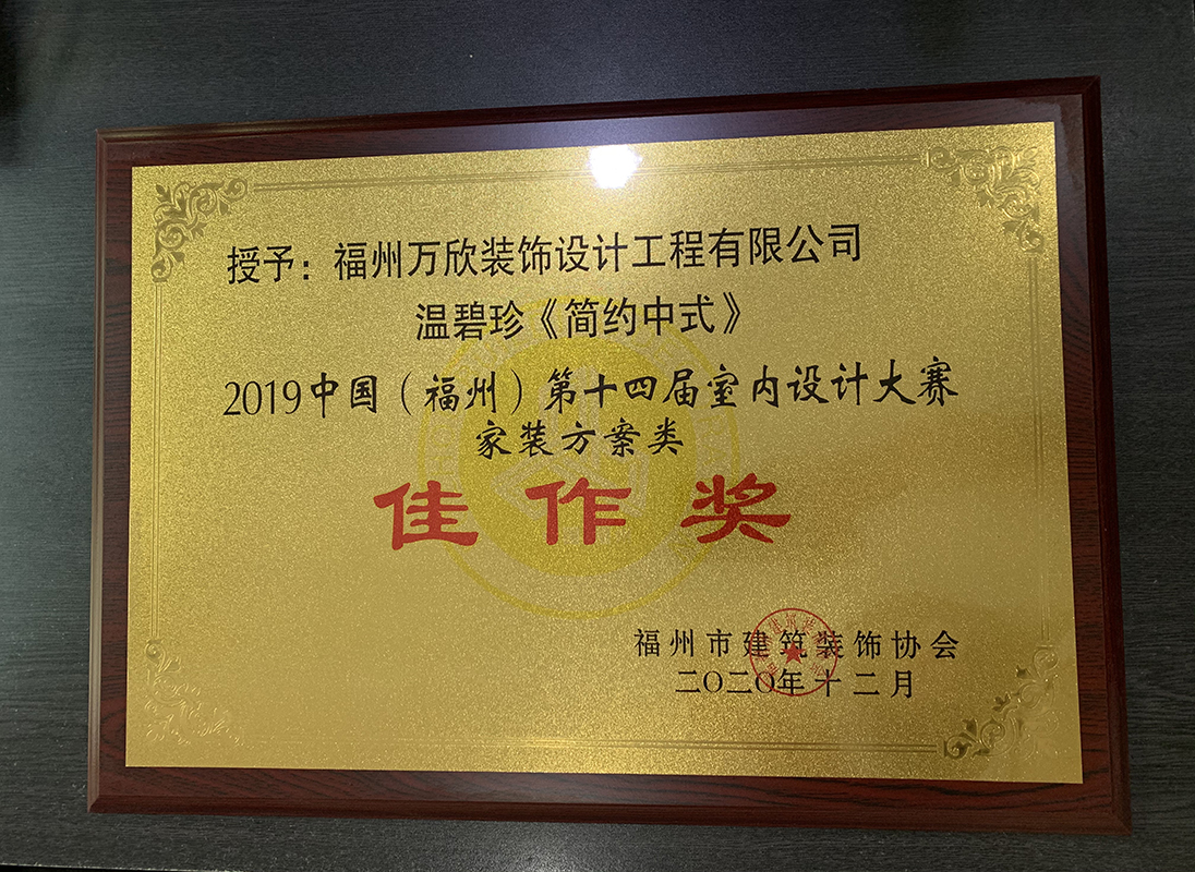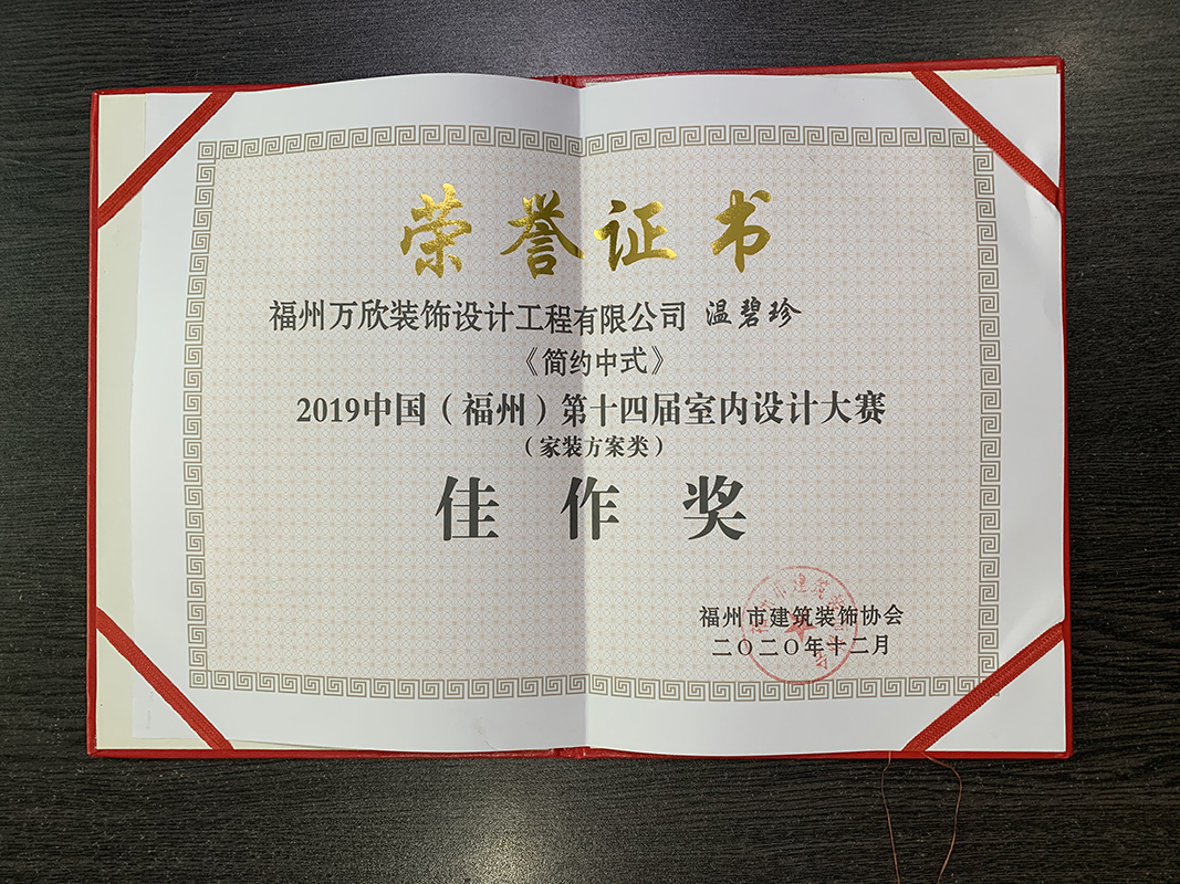 - >萬欣裝飾作品《簡約中式》被評為中國(福州)第十四屆室內設計大賽(家裝方案類)佳作獎