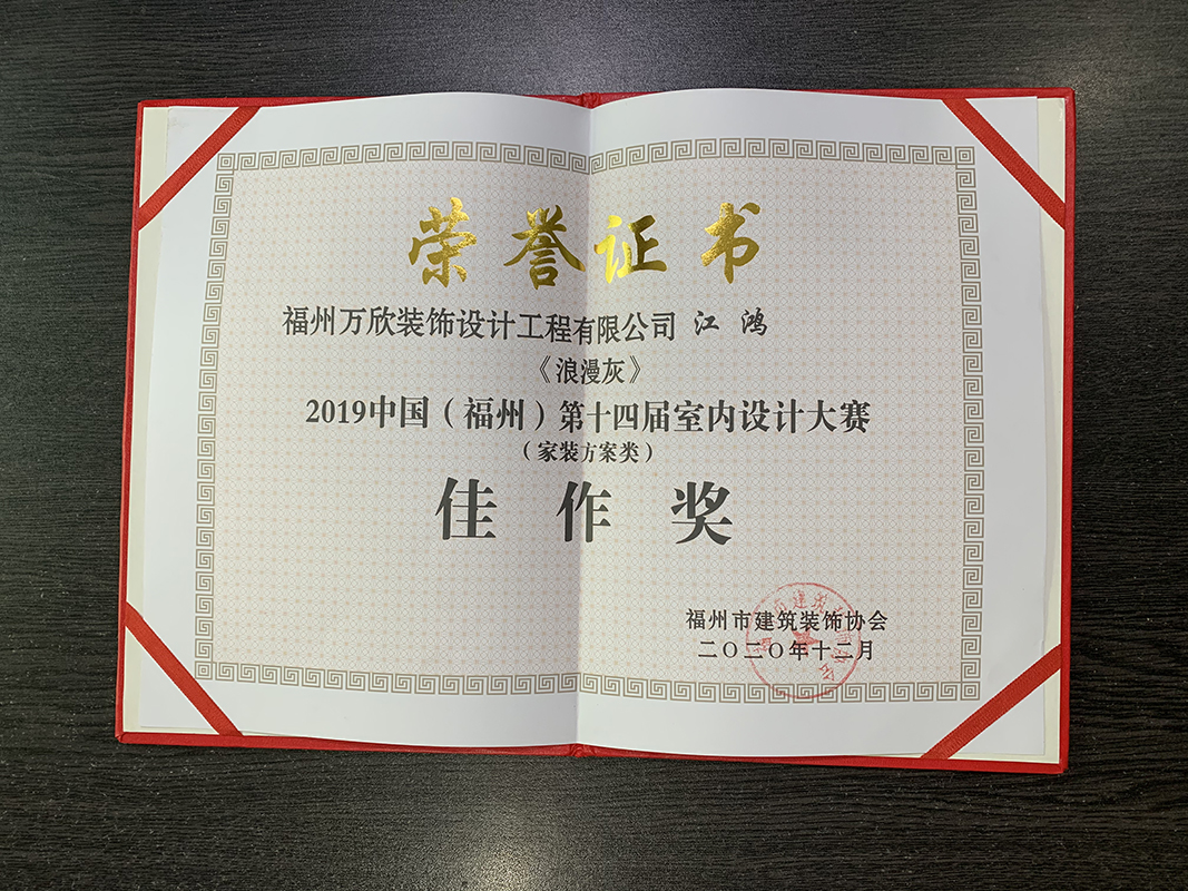 - >萬欣裝飾作品《浪漫灰》被評為中國(福州)第十四屆室內設計大賽(家裝方案類)佳作獎