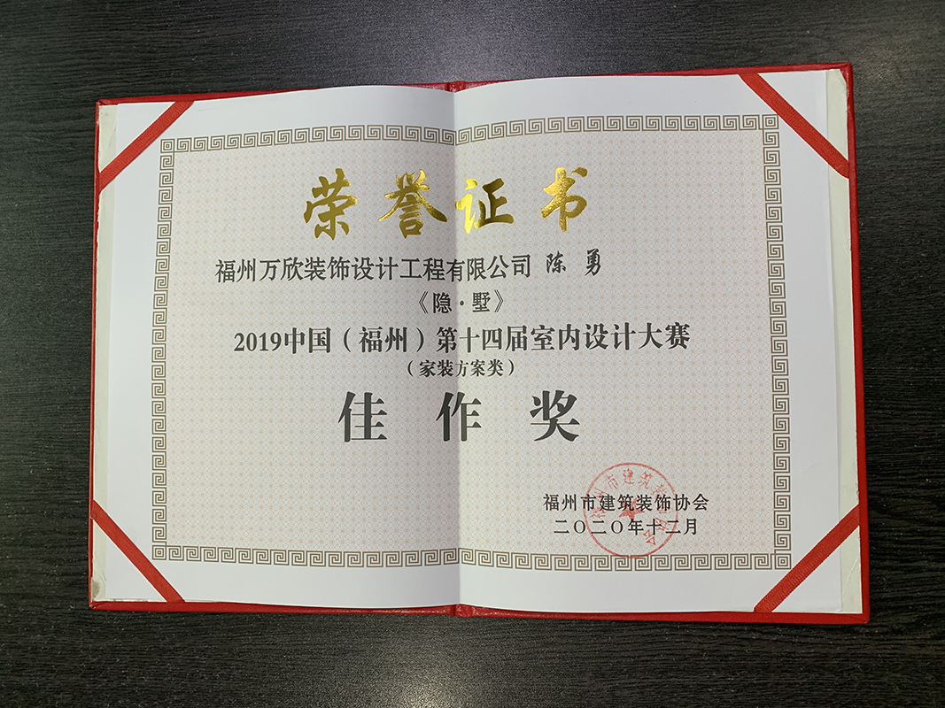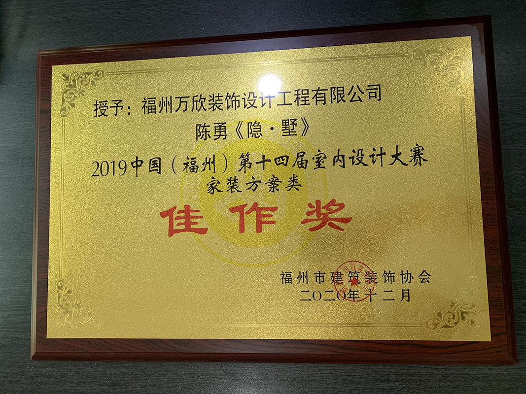 - >萬欣裝飾作品《隱.墅》被評為中國(福州)第十四屆室內設計大賽(家裝方案類)佳作獎