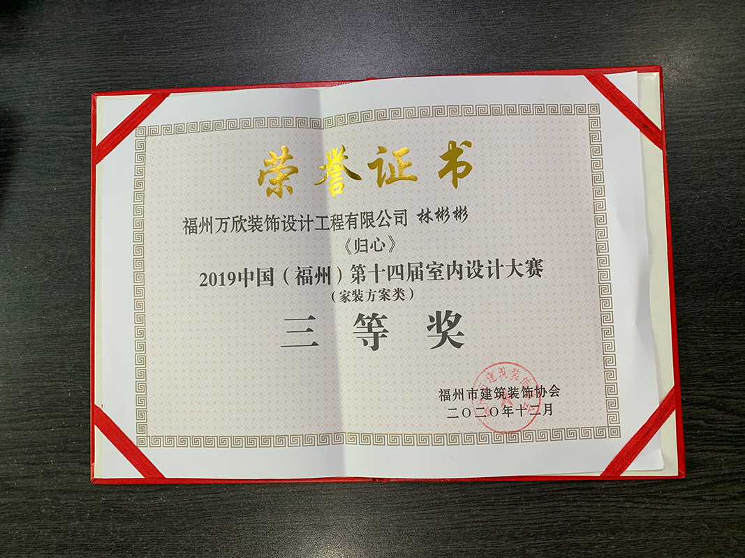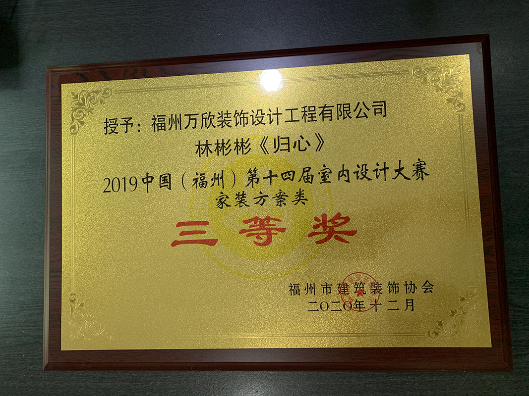 - >萬欣裝飾作品《歸心》被評為中國(福州)第十四屆室內設計大賽(家裝方案類)三等獎