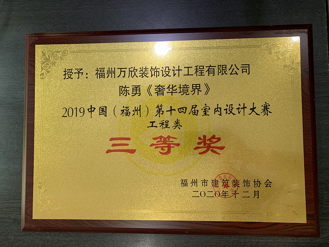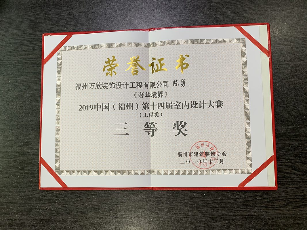 - >萬欣裝飾作品《奢華境界》被評為中國(福州)第十四屆室內設計大賽(工程類)三等獎