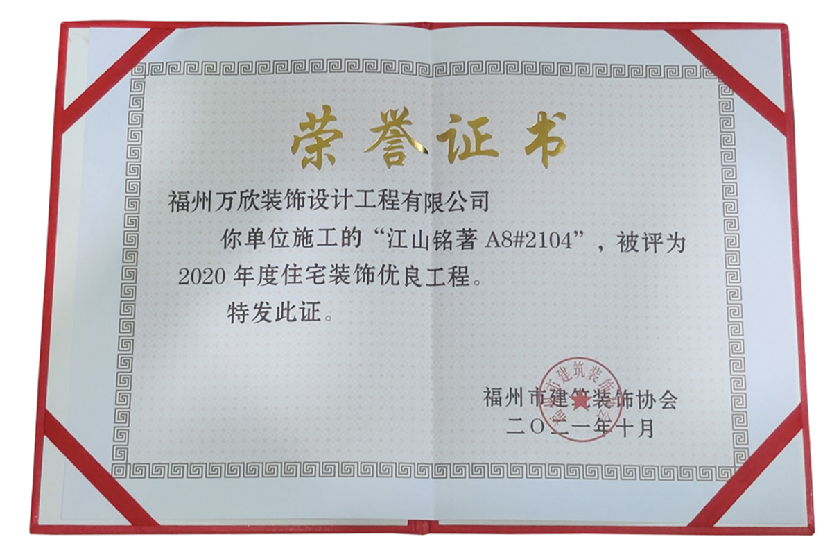- >萬欣裝飾“江山銘著A8#2104”被福州市裝協(xié)評選為優(yōu)良工程