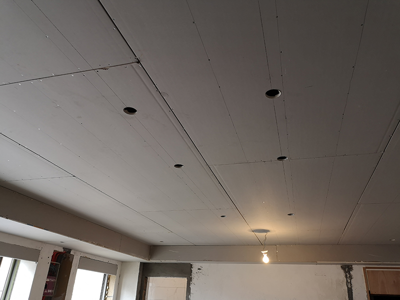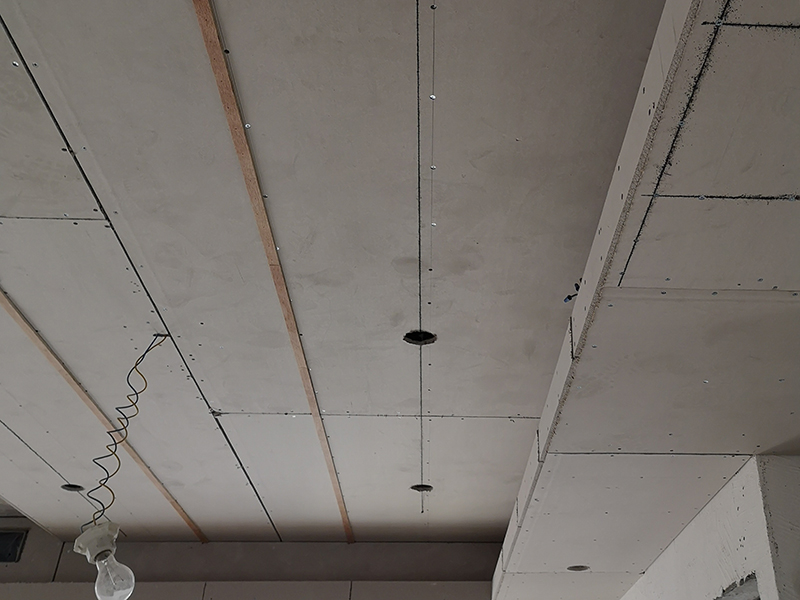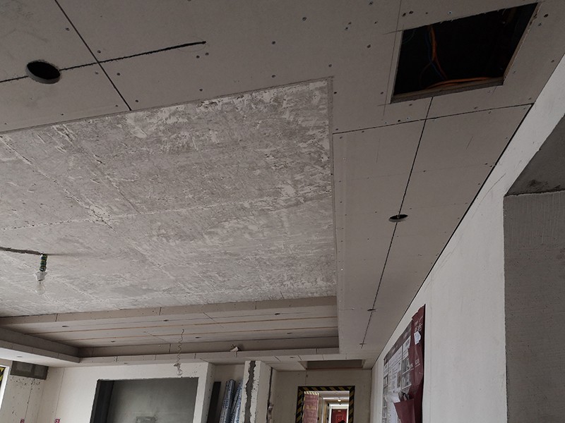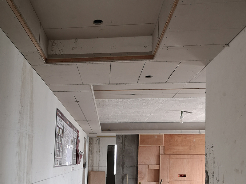 吊頂轉(zhuǎn)角L型整板防裂工藝:在石膏板吊頂轉(zhuǎn)角時采用L型整板工藝,避免在轉(zhuǎn)角處拼縫,防止整板對抗變形而引起板縫間乳膠漆面開裂。