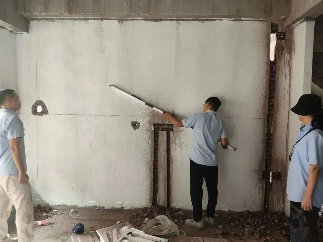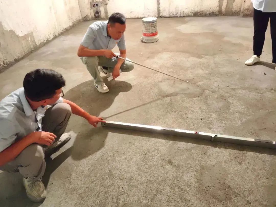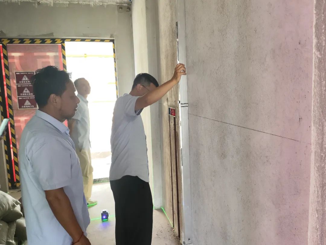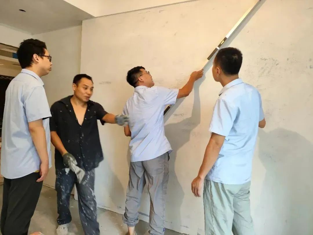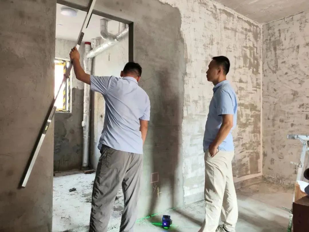 △ 現(xiàn)場(chǎng)用2米長(zhǎng)的靠尺,檢查粉刷后墻面平整與地面是否平整,防止出現(xiàn)空響等問(wèn)題,影響工程質(zhì)量和進(jìn)度。
