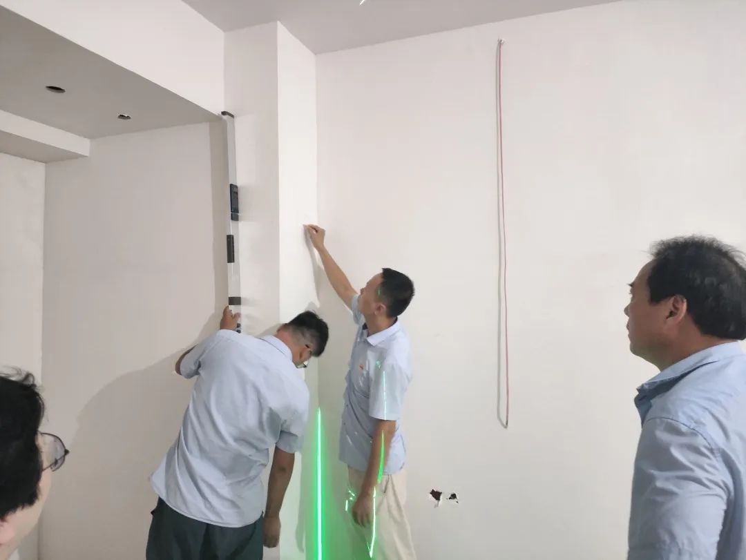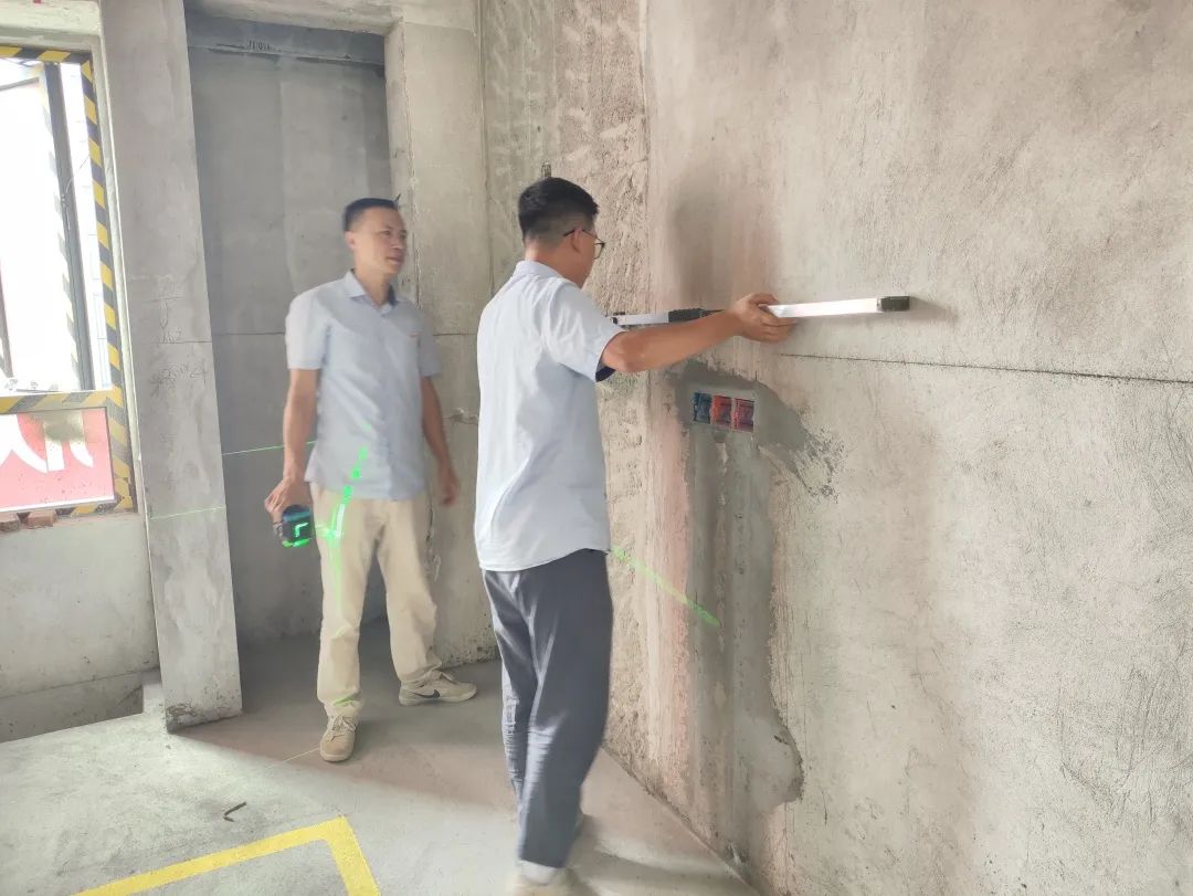 △使用2米長(zhǎng)的靠尺,檢查批灰后墻面平整是否平整,通過激光水平儀,檢查前面是否垂直。