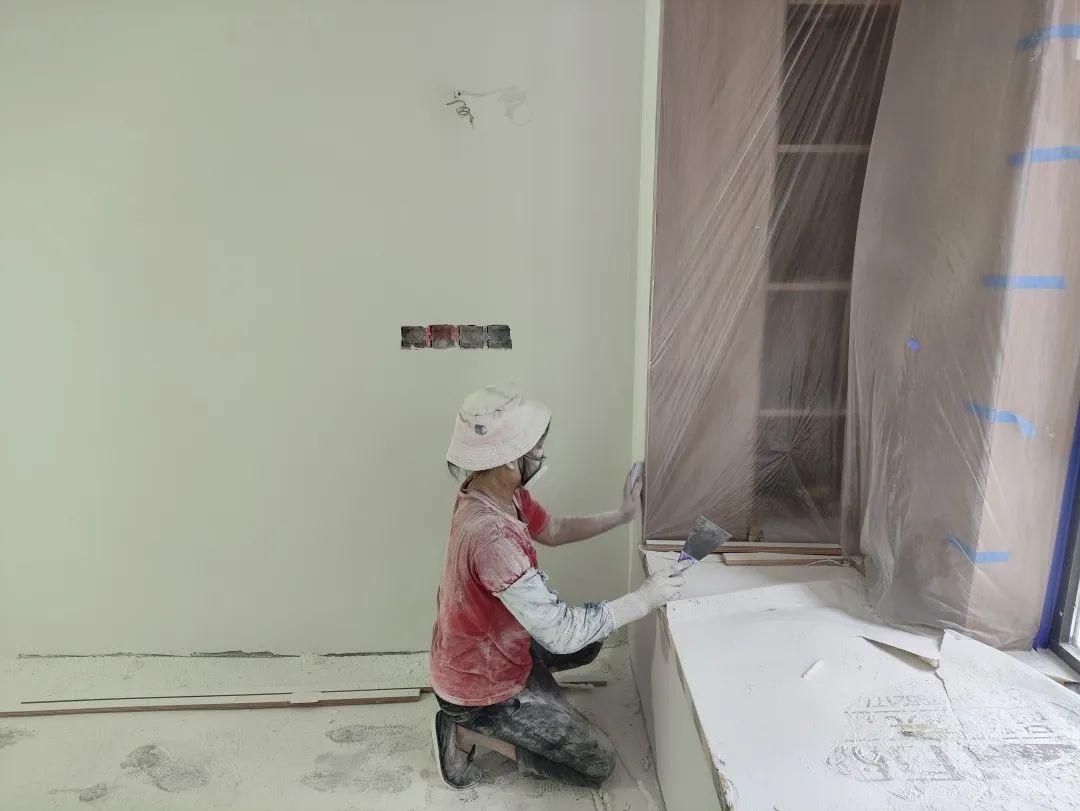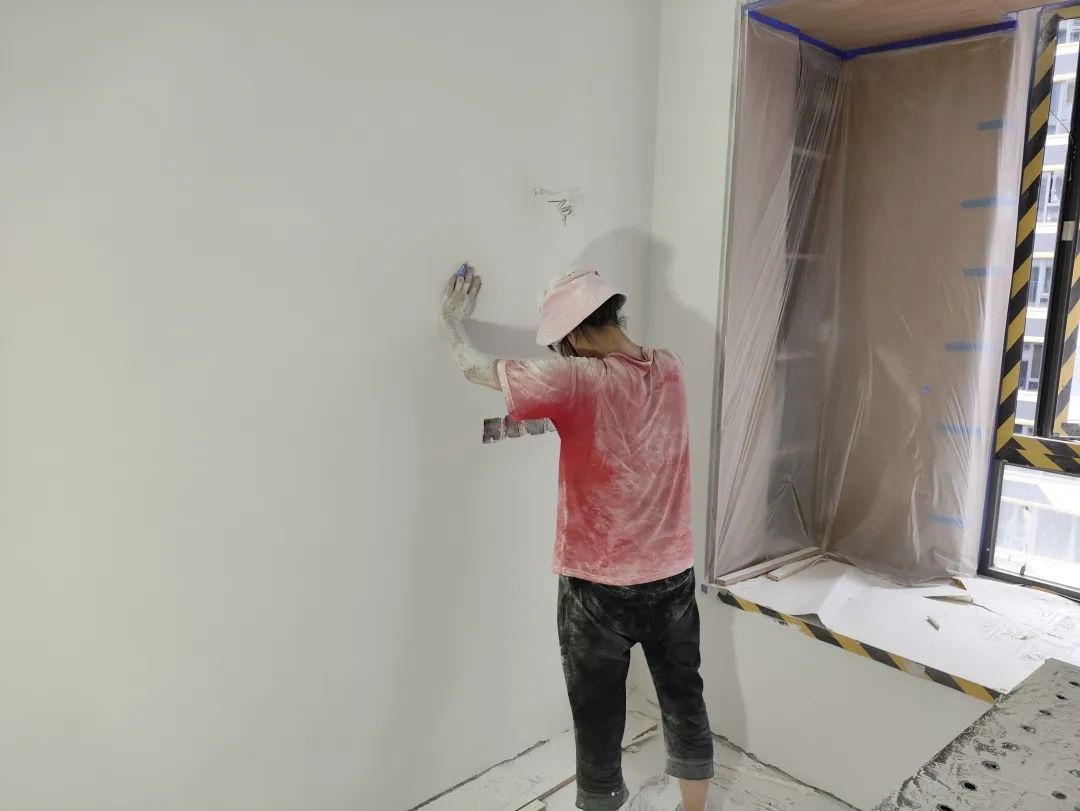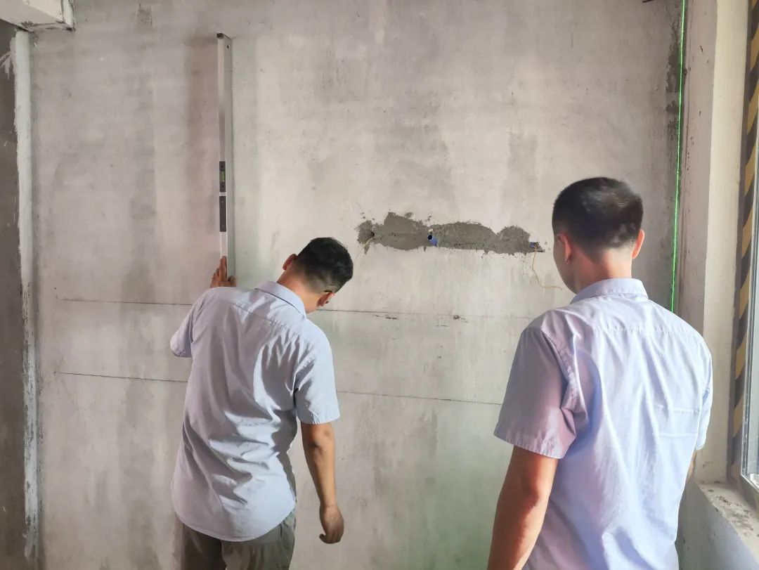 △通過手摸和眼睛觀察的方式進(jìn)行手感及墻面細(xì)節(jié)的檢查。檢查打磨后墻體的平整度,為后續(xù)噴漆施工做準(zhǔn)備。