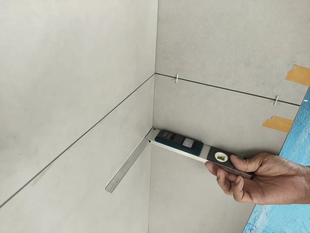 △檢查瓷磚陰角的垂直度,瓷磚陰角的垂直度關(guān)系到后續(xù)柜子和家具安裝與墻體縫隙的大小。