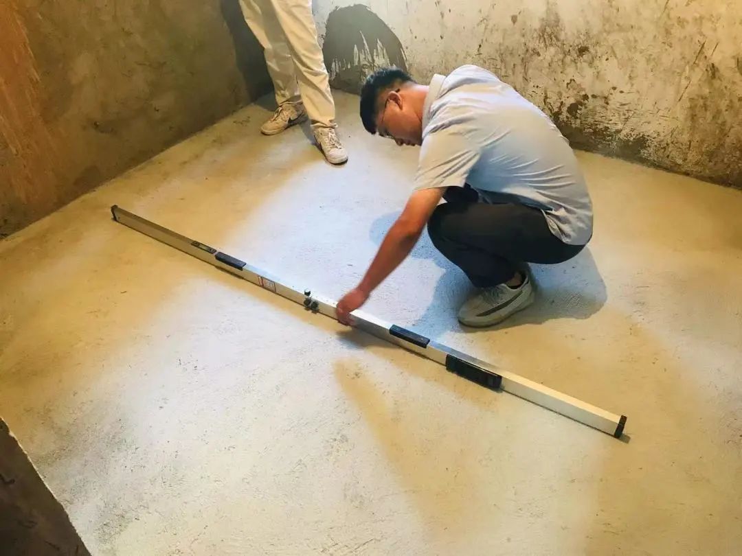 △現(xiàn)場(chǎng)用2米長(zhǎng)的靠尺檢測(cè)地面找平工作,確保每個(gè)地面平整,避免后續(xù)地板鋪設(shè)等工作留下隱患,防止出現(xiàn)空響等問題,影響工程質(zhì)量和進(jìn)度。